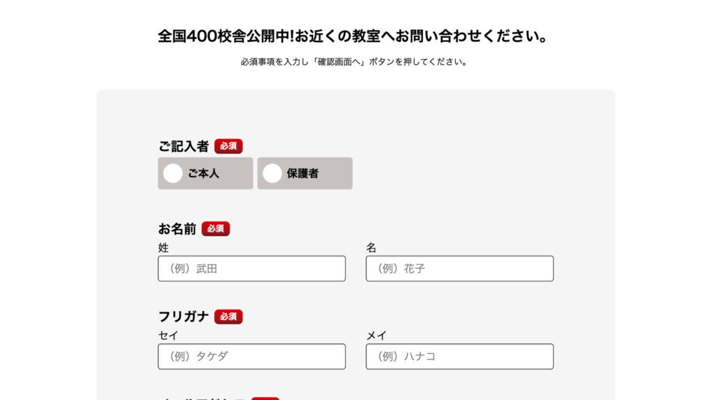 必須項目は「氏名」「メールアドレス」「学年」「問合せ内容」の4項目以内が理想です。追加で手に入れたい、住所や電話番号などは「任意」または「体験当日」に聞くことが望ましいです。 - 入力補助: